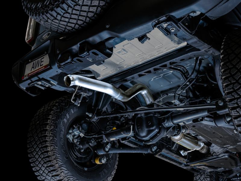 The AWE Tuning 0FG Exhaust System is expertly handcrafted from US-made 3-inch T304L stainless steel, designed specifically for the Ford Bronco models from 2021 to 2023. This modular, straight-through cat-back configuration provides an optimal balance of performance, sound, and durability, making it a top choice for Bronco enthusiasts seeking an aggressive tone combined with reliable craftsmanship. The system features a bespoke AWE resonator in the mid pipe, engineered to deliver a controlled but assertive exhaust note, while smooth bends ensure optimal airflow and minimal restriction from the front to the rear of the vehicle. This setup is compatible with both 2-door and 4-door Bronco models, with included adapters for the longer 4-door variants, ensuring a perfect fit without the need for bumper removal or cutting. The design emphasizes a clean, minimalist look with the exhaust outlet hidden above the tow hooks, maintaining maximum ground clearance and protection during off-road adventures.
