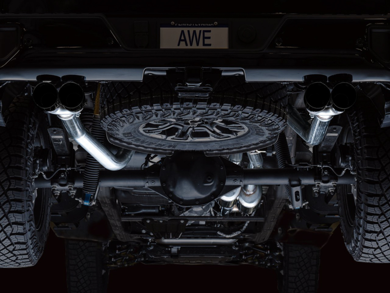 The AWE Tuning 0FG Catback Exhaust system is a high-performance upgrade designed specifically for the 2022-2024 GMC Sierra 1500 AT4X with a 6.2L engine. Crafted from CNC mandrel-bent U.S.-sourced T304L stainless steel with a .065-inch wall thickness, this dual 3-inch exhaust offers durability and precision fitment that enhances both the sound and performance of your vehicle. The system connects seamlessly after the factory emissions equipment, ensuring straightforward installation and maintaining factory reliability. The tailored H-pipe configuration provides a deep, aggressive V8 muscle tone with minimal rasp, delivering an exhilarating exhaust note that truly stands out. The inclusion of AWE’s patented 180 Technology® resonators effectively cancels drone frequencies, resulting in a refined sound experience at highway speeds. The quad 4-inch slash-cut tips in diamond black finish add a bold aesthetic, exiting under the rear bumper for a clean, custom look. The quad tips are mounted with ball & socket joints, allowing for easy adjustment and perfect alignment. Additionally, the system’s design features a modular rear section, making it simple to add the optional BashGuard for added protection. AWE guarantees perfect fitment, no check engine light issues, and backs the system with a lifetime warranty, making it a reliable choice for enthusiasts seeking optimal sound and performance. Engineered for durability and tuned for sound, this exhaust set is ready to elevate your Sierra AT4X’s presence on and off the road.