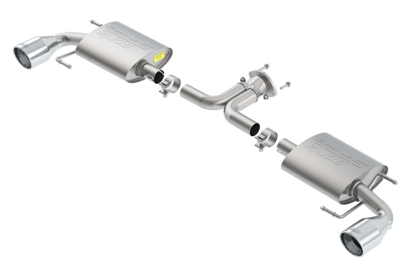 Enhance your 2014-2018 Mazda 3 with the Borla S-Type Axle-Back Exhaust System, engineered for optimal performance and a distinctive sound. Crafted from premium T-304 stainless steel, this system features polished tips and ultra-smooth mandrel bends to maximize exhaust flow, resulting in increased horsepower, improved fuel economy, and a more aggressive exhaust note. The patented straight-through and multi-core technology ensures efficiency and durability, providing a significant upgrade over standard exhaust systems. Built with precision CNC manufacturing, the Borla S-Type exhaust guarantees an accurate fit and long-lasting performance, backed by a Million-Mile Warranty for peace of mind.Designed specifically for 2014-2018 Mazda 3 models with 2.0L and 2.5L engines, both automatic and manual transmissions, and front-wheel drive configurations, this exhaust system is a straightforward upgrade that transforms your driving experience. The single split rear exit design complements the vehicle’s aesthetics while delivering the signature Borla Sound of Power, appreciated by enthusiasts for its deep, refined tone. Installation is simplified with high-quality components, ensuring a secure fit without extensive modifications. Whether you seek enhanced performance, a more aggressive sound, or both, the Borla S-Type Axle-Back system offers an exceptional solution for Mazda 3 owners looking to elevate their vehicle’s capabilities and sound profile.As a product of Borla, the most experienced and acclaimed exhaust brand, this system embodies innovation, quality, and reliability. Perfectly suited for daily driving or spirited outings, it provides a noticeable performance boost and a commanding exhaust note that turns heads. With its durable construction and comprehensive warranty, the Borla S-Type Axle-Back Exhaust System is an investment in your vehicle’s performance and sound that will last for miles to come.