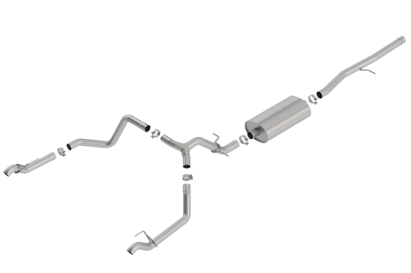 Upgrade your 2019-2025 Chevrolet Silverado 1500 or GMC Sierra 1500 with the Borla Part Number 140767 Touring Cat-Back Exhaust System, designed to deliver a refined, mellow exhaust note without drone during highway cruising. Crafted from high-grade T-304 stainless steel, this system ensures durability and superior performance, outperforming lower-grade T-400 series materials. Its mandrel-bent tubing maximizes exhaust flow, unlocking hidden horsepower and improving fuel efficiency while providing the distinctive Borla sound that enthusiasts respect. The system features a straight-through, multi-core design that enhances exhaust velocity, contributing to increased power and driving excitement. This bolt-on upgrade is designed to fit factory split rear exit configurations and is compatible with Trail Boss models. The system includes provisions for factory tips—tips are not included but can be reused or upgraded with Borla’s optional tip packages. Please note that an adapter (60708) is recommended for Crew Cab models with a standard bed and an 8-foot wheelbase. Precision CNC manufacturing guarantees an accurate fit, and Borla backs this system with a Million-Mile Warranty, ensuring long-lasting performance. Whether you’re looking for a performance boost, improved sound, or a sleek appearance, this Borla system provides an excellent upgrade for your truck.