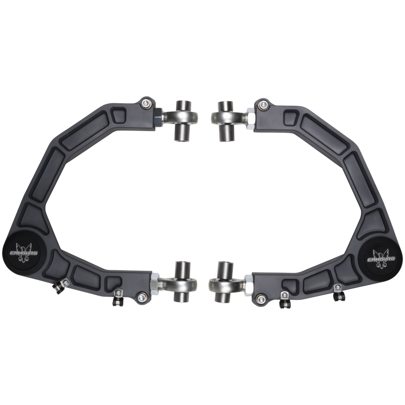 Upgrade your Toyota Tundra’s suspension with the Camburg KINETIK V2 Performance Billet Uniball Upper Arms. Crafted from aerospace-quality 6061 billet aluminum, these arms are meticulously engineered using CAD and CNC machining to ensure precision fit and durability. The sleek gun metal gray finish, achieved through bead blasting, Type II anodizing, and laser etching with the Camburg logo, provides both corrosion resistance and a refined appearance. Designed specifically for 1-3 inches of lift, these upper arms are a superior alternative to factory components, eliminating weak ball-joints and enhancing overall suspension performance. The larger FK 1.25-inch uniball with a PTFE liner offers increased strength, improved misalignment, and maximum wheel travel. The design includes model-specific spacers machined from heat-treated stainless steel that adapt the uniball to the spindle or knuckle without modification, simplifying installation. The 1.25-inch uniball features a low-profile press-on cap and larger bolt for improved element resistance, ensuring long-lasting performance in off-road conditions. The use of FK 7/8-inch chromoly heim joints allows for precise camber and caster adjustments, while preventing flexing, deflection, and binding. AN/Mil-spec hardware, including a pinch bolt and secondary jam nut, guarantees secure mounting even in demanding off-road environments. All necessary hardware for installation is included, making the upgrade straightforward. These arms are designed to improve wheel travel, correct camber and caster angles, and replace weak factory ball-joints, providing a significant upgrade for off-road enthusiasts and Toyota Tundra owners seeking reliable, high-performance suspension components. Note that wheel size, offset, backspacing, and tire dimensions may require trimming or modifications to prevent tire rubbing and ensure optimal fitment.