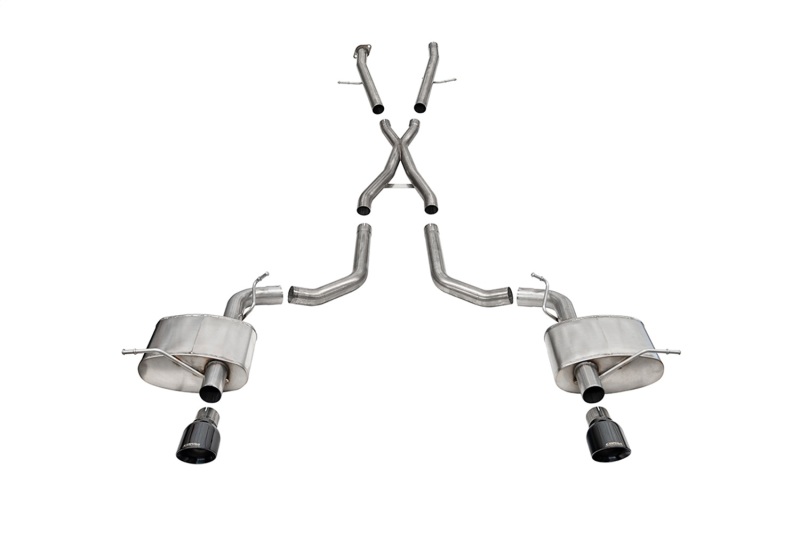 Enhance your 2021-2025 Dodge Durango Hellcat with the CORSA Performance Cat-Back Exhaust System, engineered for optimal sound and performance. Crafted from durable 304 stainless steel, this exhaust system features a 2.75-inch diameter dual rear exit design that flows 15% better than stock, ensuring improved exhaust efficiency and a more aggressive engine tone. The system includes dual wall stainless steel tips finished in sleek black PVD coating, adding a refined visual appeal to your vehicle’s rear end. Designed with CORSA’s patented No Drone RSC technology, this exhaust delivers a commanding sound without the unwanted cabin drone, even during long highway drives. The system offers two sound profiles: the Sport level, which is 6 decibels louder than stock for an aggressive yet controlled sound during cold starts and acceleration, and the Xtreme level, which increases the volume by 17 decibels, delivering a more pronounced and aggressive exhaust note that turns heads while maintaining manageable interior noise levels. Installation is straightforward with bolt-on components, making it accessible for DIY enthusiasts and professional installers alike. Made in the USA and backed by a Limited Lifetime Warranty, this exhaust system not only boosts performance but also ensures long-lasting quality and satisfaction. Whether you prefer a polished finish or black PVD coating, this system complements your Durango’s style and enhances its sound profile, making it a perfect upgrade for the true enthusiast seeking both performance and auditory presence. With CORSA’s commitment to the Science of Sound©, you can trust this system to deliver a powerful, refined exhaust experience tailored to your preferences.