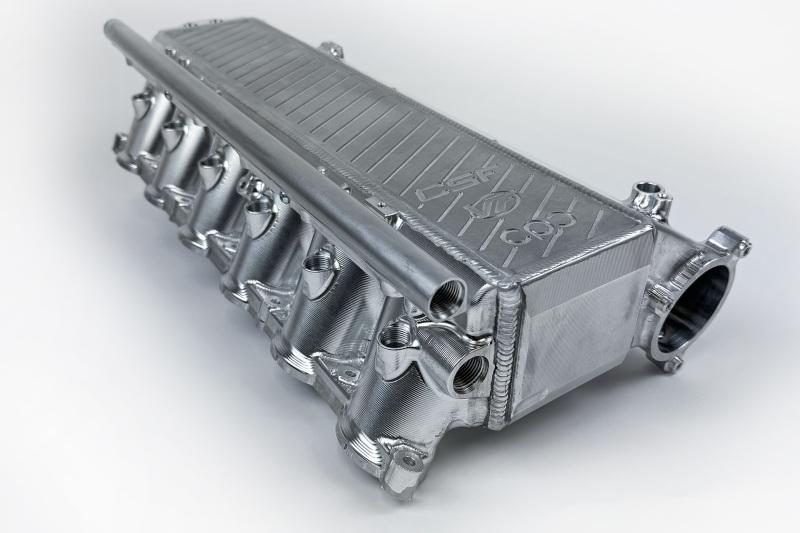 The CSF #8300 charge-air-cooler manifold is designed specifically for the Gen 1 BMW B58 engine, offering a significant upgrade over OEM components for enthusiasts seeking enhanced performance. Built with a motorsports-grade bar/plate air-to-water intercooler core, it doubles the capacity of the stock unit, effectively reducing intake air temperatures and minimizing heat soak during demanding driving conditions such as spirited street driving, racing, or high-boost applications. The manifold is engineered with computational fluid dynamics (CFD) to optimize airflow distribution, utilizing an integrated air divider in the inlet tank to ensure uniform air delivery to each cylinder. Finished in raw billet aluminum, it can also be customized in thermal black Cerakote or other finishes, providing both durability and aesthetic appeal.