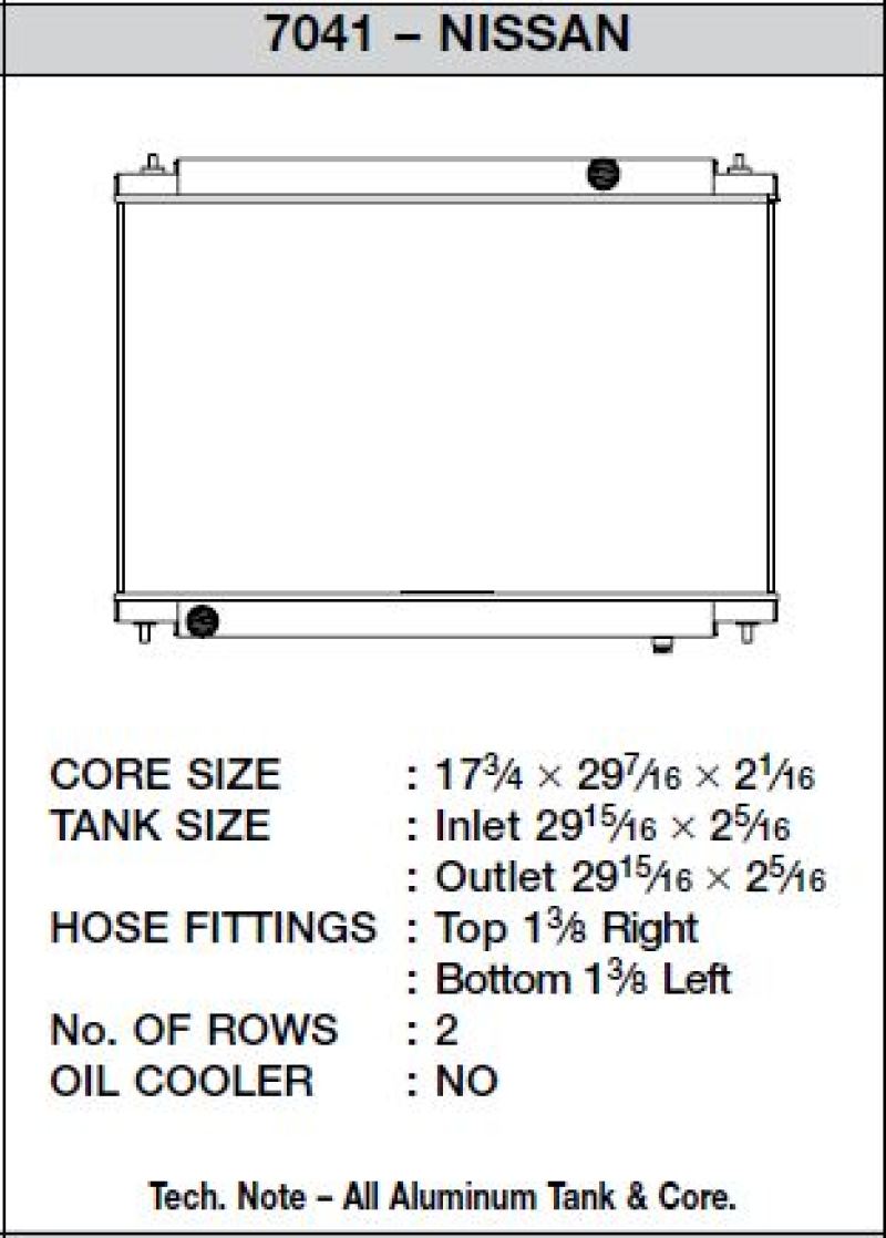 The CSF Part #7041 High-Performance All-Aluminum Radiator is engineered specifically for Nissan GT-R models from 2009 to 2014, delivering exceptional cooling performance for street and track use. With over 50 years of experience in radiator manufacturing, CSF has developed a product that meets the demands of high horsepower builds and motorsports environments. Featuring a 2-Row core with CSF’s innovative B-Tube Technology, this radiator maximizes heat transfer and airflow efficiency. Unlike traditional oval tubes, the specially designed B-tubes are formed with a precise shape and brazed seam, allowing for a thinner, lighter, yet stronger tube that enhances cooling capacity. The design increases the heat transfer surface area by approximately 15%, providing dual liquid laminar flow for superior heat dissipation. The radiator is equipped with ultra-efficient multi-louvered fins, carefully aligned and measured for maximum airflow and heat rejection. This ensures optimal cooling, whether you’re on the street or at the race track. The radiator is designed as a “drop-in fit,” requiring no modifications for installation and compatible with OEM components including quick-connect hoses, the AC condenser, mounting brackets, and the fan shroud. CNC-machined brackets and fittings ensure a precise fit and durability, while the satin finish adds a sleek appearance. The inclusion of a race-style all-aluminum drain plug simplifies maintenance. This radiator provides a significant upgrade over stock units, ensuring your Nissan GT-R maintains optimal operating temperatures under demanding conditions and high-performance scenarios. It is a reliable choice for enthusiasts seeking to enhance their vehicle’s cooling system with a product backed by industry-leading testing and manufacturing standards.
