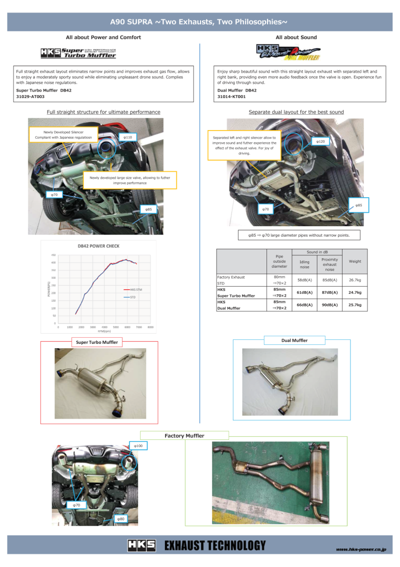 Enhance your vehicle’s performance with the HKS Super Turbo Muffler designed specifically for the Toyota Supra DB42 B58. Crafted with precision, this high-performance muffler offers improved exhaust flow, resulting in increased horsepower and a more aggressive sound. Constructed from durable materials, it ensures longevity and reliable operation under demanding driving conditions. The muffler is engineered to meet strict emission standards, requiring CARB acknowledgment for legal compliance in certain regions. Installation is straightforward, making it suitable for enthusiasts looking to upgrade their exhaust system without extensive modifications.