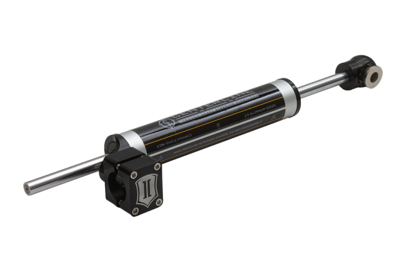 The ICON Centerline Steering Stabilizer Kit for 2007-2018 Jeep Wrangler JK offers enhanced steering control and durability, designed with high-quality components for off-road and on-road performance. This stabilizer features a 6063 aluminum shock body with a clear anodized finish, providing excellent corrosion resistance and efficient heat dissipation to maintain performance in harsh conditions. The 5/8-inch chrome plated hardened steel shaft ensures long-lasting strength, while the premium 5WT shock oil delivers consistent damping across a wide temperature range, reducing steering wobble and improving overall handling. The through-shaft design eliminates the push/pull sensation common with traditional stabilizers, offering a smoother and more precise steering experience. The kit mounts using CNC machined billet aluminum tie rod clamps, with optional clamps available for heavy-duty aftermarket tie rods, ensuring a secure fit regardless of your setup. FK spherical bearings in the rod end provide precise and reliable operation, maintaining optimal steering feel throughout the input range. This fully serviceable shock is designed for a bolt-on installation, making it straightforward to upgrade your vehicle without modifications. The stabilizer increases steering damping over stock units, resulting in improved vehicle control during aggressive driving or off-road excursions, ultimately enhancing driver confidence and safety. Designed to mount to the OE tie rod with a 1-3/8-inch diameter, this stabilizer is compatible with a variety of Jeep Wrangler JK models from 2012 to 2013. Please note that if using a heavy-duty 1-5/8-inch aftermarket tie rod, an oversized clamp kit (PN: 614525) is required. This product is Prop 65 compliant and not CARB approved, making it suitable for most applications requiring high-performance steering stabilization. The ICON Centerline Stabilizer Kit is an essential upgrade for Jeep enthusiasts seeking reliable steering control and durability for demanding off-road conditions.
