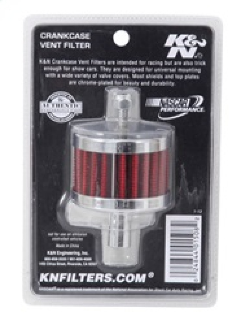 The K&N Engineering 62-1100 crankcase vent filter is designed to enhance the appearance and functionality of your classic or racing engine. Featuring a durable chrome-plated steel base and top with a mounting stud, this filter provides a sleek and corrosion-resistant finish suitable for vintage cars and high-performance racing applications. The 5/8 inch zinc tube clamps easily onto metal or plastic tubing, making installation straightforward and secure. Constructed with non-woven synthetic gauze filter media, it offers excellent filtration while remaining washable and reusable, promoting long-term cost savings and environmental responsibility. This filter is ideal for those seeking both aesthetic appeal and reliable engine venting, especially in custom or vintage builds. Please note, it is legal in California only for racing vehicles that may never be used, registered, or licensed for highway use. For specific vehicle compliance and CARB status, consult knfilters.com. Designed to provide efficient venting without compromising engine cleanliness, this filter is a practical addition for automotive enthusiasts aiming for a combination of style and performance.