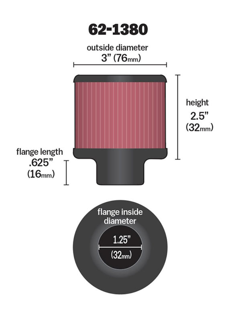 The K&N Engineering 62-1380 crankcase vent filter offers a combination of functionality and aesthetics, making it ideal for racing applications, vintage cars, or custom classic engines. This filter features a durable black rubber top and base, designed to withstand engine vibrations and environmental factors. Its 2.5-inch height and 3-inch outside diameter provide a compact yet effective solution for venting crankcase gases, while the 1-1/4 inch inside diameter flange ensures a secure clamp onto existing vent tubes or outlets.