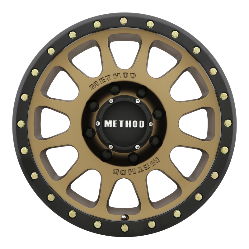 The Method Wheels MR305 NV is a high-performance 17-inch wheel designed for off-road and street use with a distinctive 12-window design featuring a debossed Method logo on each side of the center cap. Crafted from solid A356 aluminum with T6 heat treatment, this wheel offers exceptional strength and durability for demanding driving conditions. The Industry-leading structural warranty underscores Method Wheels’ commitment to quality and reliability. Its street-loc V.1 lip with an undercut design mimics a true beadlock wheel, providing both aesthetic appeal and enhanced trail performance. The wheel comes with a push-through center cap embossed with the Method logo for a sleek, flush appearance, with optional flush cap accessories available separately. The MR305 NV is compatible with 8×170 bolt pattern vehicles, making it suitable for a variety of trucks and SUVs. Features include replaceable lip bolts (sold separately) with optional colors to customize your look, and the undercut lip design that enhances its rugged, aggressive stance. This wheel is finished in a stylish bronze and black color scheme, perfect for those seeking a bold, confident appearance. Designed for versatile performance, it is suitable for off-road adventures, daily driving, and show-stopping custom builds. Whether you’re upgrading your truck or SUV, the Method MR305 NV combines innovative styling, structural integrity, and customization options to meet the demands of modern vehicle enthusiasts.