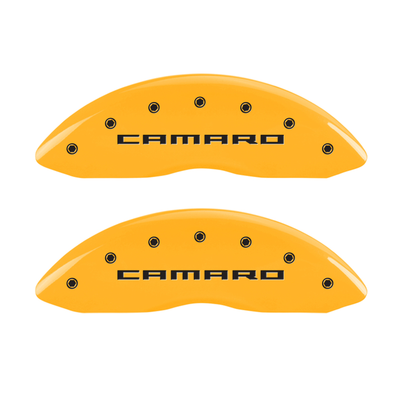 Enhance the appearance of your 2010-2015 Chevrolet Camaro with the MGP 14033SCA5YL caliper covers. Designed specifically for Gen 5 and 6 Camaros, these high-quality aluminum covers are finished with a durable yellow powder coat and feature black engraved characters for a striking look. They are engineered to hide the factory brake calipers, giving your vehicle a cleaner, more polished wheel appearance while also protecting the brake components from dust and debris. The set includes four caliper covers along with stainless steel fastening clips, ensuring a secure fit and easy installation that can be completed in approximately one hour.