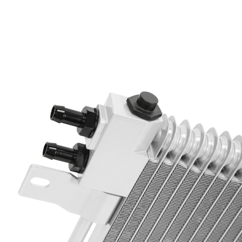 Ensure your Dodge Ram 2500 or 3500’s transmission stays cool and operates efficiently with the Mishimoto 03-09 Dodge Ram 5.9L/6.7L Cummins transmission cooler. Designed specifically for models from 2003 to 2009, this direct-fit cooler features a durable stacked plate core that provides superior cooling capacity. Its large core volume and fluid capacity significantly outperform the stock cooler, with a 212-percent increase in core volume and a 244-percent increase in fluid capacity, making it ideal for towing, heavy-duty work, or daily driving. This robust design helps prevent overheating, which is a common cause of transmission failure, especially during demanding tasks. The cooler’s larger size not only improves thermal management but also enhances reliability over stock units, which can fail when their thermostats malfunction or bypass fails. Mishimoto has addressed this issue by incorporating a fully serviceable thermostat that is easily accessible at the top of the cooler, allowing quick maintenance or bypass if necessary. Replacement thermostats are available for purchase separately, ensuring continued optimal performance. Constructed to fit all 2003-2009 Dodge Ram 5.9L and 6.7L Cummins engines, this transmission cooler is a straightforward upgrade for those seeking better cooling and increased transmission lifespan. It is compatible with popular models including 2006-2009 Dodge Ram 2500 and 2006-2007 Dodge Ram 3500, providing a reliable solution for heavy-duty applications or extensive towing. The Mishimoto transmission cooler not only enhances your vehicle’s performance but also offers peace of mind by safeguarding your transmission against heat-related damage. Its quality construction and thoughtful design make it a smart investment for any Dodge Ram owner looking to extend the life of their transmission and improve overall vehicle reliability. Whether for work or recreation, this cooler is engineered to meet demanding conditions and deliver consistent, high-performance cooling for your Cummins-powered Dodge Ram.