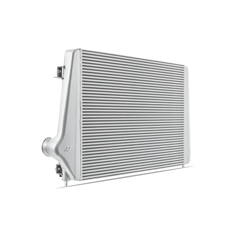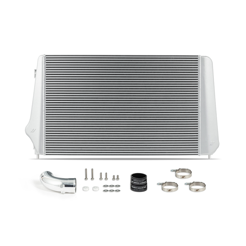 Enhance your 2017-2019 Chevrolet or GMC 6.6L Duramax L5P engine performance with the Mishimoto Performance Intercooler. Designed to improve cooling efficiency and reduce intake temperatures, this intercooler helps maintain optimal engine power and prevents potential damage caused by high heat. Constructed with durable cast-aluminum end tanks, it resists cracking under high-pressure conditions, ensuring longevity and reliability. The 68mm-thick bar-and-plate core is 70% thicker than the stock unit, providing maximum cooling capacity while significantly reducing restriction by over 64%. This upgrade allows for better airflow and increased power output, especially during demanding driving conditions. The larger inlet and outlet ports, increased by 6mm and 12mm respectively, further enhance flow, reducing pressure drop and boosting overall engine efficiency. Included with the intercooler is an adapter cold-side pipe with a DuraCore™ boot and constant-tension T-bolt clamps, ensuring a secure fit. Two additional bungs on the adapter pipe are available for sensors or water/meth injection, making it customizable to your specific needs. Finished in a sleek Silver powder coat, this intercooler combines form and function for a professional, high-performance upgrade. Backed by Mishimoto’s lifetime warranty, it offers peace of mind and long-term durability. This intercooler is essential for enthusiasts seeking to maximize their Duramax’s potential while maintaining reliability and strength under demanding conditions, making it an excellent choice for serious modders and daily drivers alike.