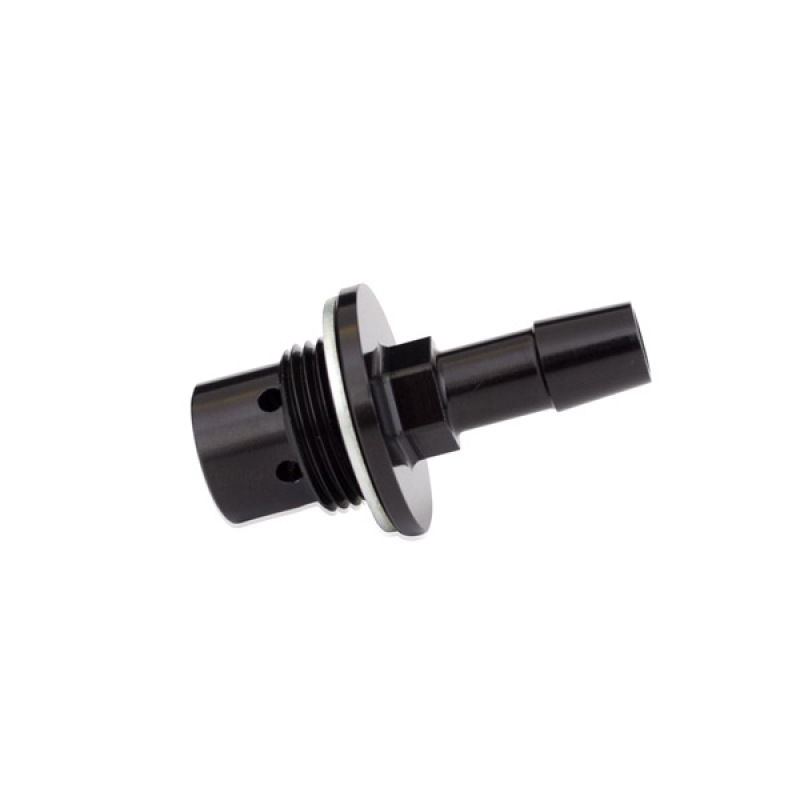 - Custom 6061 aluminum drain fitting with 3/8-inch hose barb allows baffle to be retained