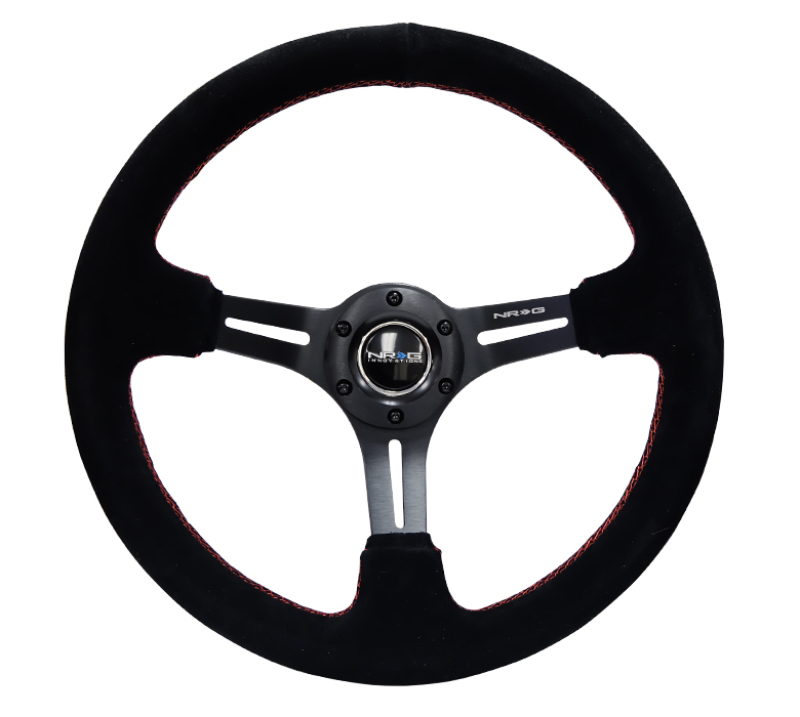 Enhance your vehicle’s interior with the NRG Reinforced Steering Wheel, designed for a perfect blend of style and performance. This 350mm diameter steering wheel features a deep 3-inch grip, providing improved handling and a more immersive driving experience. Crafted from high-quality black suede, it offers a comfortable and secure grip, ideal for both daily driving and spirited performance. The distinctive red stitching adds a sporty touch, elevating your vehicle’s aesthetic appeal.