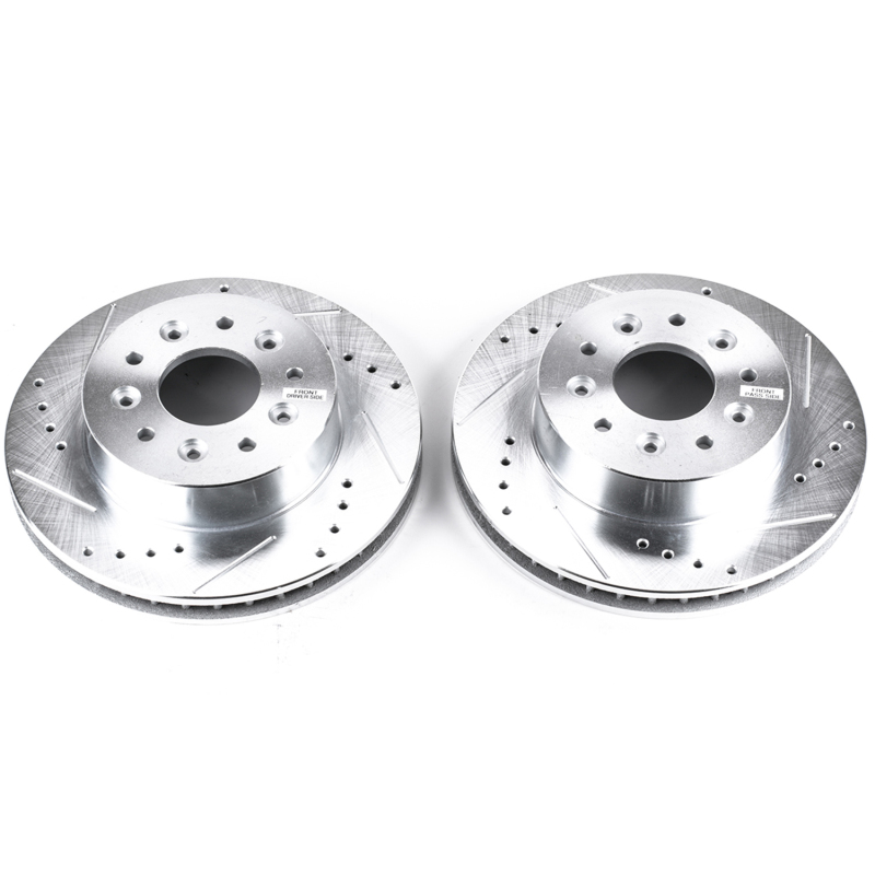 Upgrade your Chevrolet Corvette with the Power Stop Evolution drilled and slotted rotors, designed to enhance braking performance and cooling efficiency. These rotors are precision manufactured to strict tolerances, ensuring smooth and quiet operation with minimal vibration. The cross-drilled design maximizes heat dissipation, helping to prevent brake fade during intense driving conditions, while the rounded slots efficiently sweep away gases, dust, and moisture to maintain optimal contact on the rotor surface. The zinc dichromate plating provides robust resistance against rust and corrosion, extending the longevity of your brake components. These rotors are a direct bolt-on replacement for stock brakes, requiring no modifications for installation, making them an easy upgrade for enthusiasts and everyday drivers alike. They are engineered to match the original equipment weight and vane count, ensuring consistent performance and reliability. Each pair of rotors is 100% dynamically mill balanced to eliminate vibrations and deliver a smooth braking experience. Designed specifically for a range of Chevrolet Corvette models from 1974 to 1982, these rotors are ideal for drivers seeking improved brake cooling and overall stopping power without compromising on quality or safety.