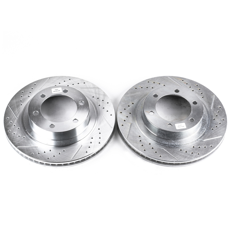 Upgrade your Toyota 4Runner’s braking system with the Power Stop JBR975XPR Evolution drilled and slotted rotors, designed for optimal performance and durability. These rotors feature precision cross-drilled holes that enhance cooling by dissipating heat quickly, reducing brake fade during intense driving conditions. The rounded slots effectively sweep away gasses, dust, and moisture, maintaining a clean contact patch for consistent braking power. Constructed with zinc dichromate plating, they resist rust and corrosion, ensuring longevity even in harsh environments. These rotors are manufactured to strict tolerances for smooth, quiet operation and are 100% dynamically balanced to prevent vibrations. They are a direct bolt-on replacement for stock rotors and require no modifications, making installation straightforward. The design matches original equipment specifications, including weight and vane count, to maintain vehicle balance and performance. With chamfered drill holes and rounded slots, these rotors minimize stress cracking, enhancing durability under demanding conditions. Sold as a pair, they provide a comprehensive upgrade for your front braking system, delivering improved cooling, reduced dust, and longer-lasting performance for your Toyota 4Runner from 2003 to 2009.