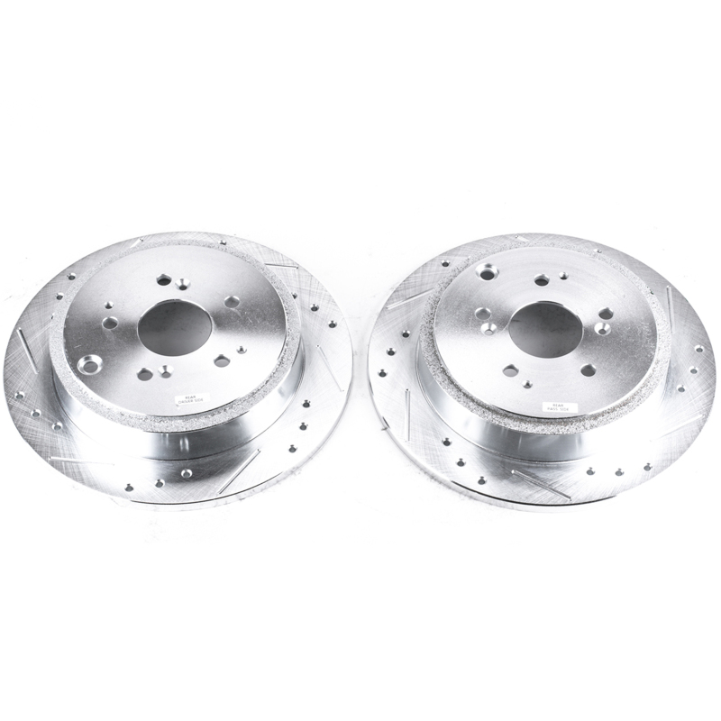 Upgrade your vehicle’s braking system with the PowerStop JBR960XPR Evolution drilled and slotted rotors, designed specifically for the rear of select Acura MDX models from 2001 to 2004 and Honda Pilot from 2003. These rotors are engineered to enhance brake cooling and overall performance, providing a safer and more responsive driving experience. The precision cross-drilled holes maximize heat dissipation during extreme conditions, helping to prevent brake fade and maintain consistent stopping power. Rounded slots sweep away gasses, dust, and moisture, ensuring a clean friction contact patch for optimal performance and longevity. The zinc dichromate plating offers excellent resistance to rust and corrosion, maintaining the rotor’s appearance and function over time.
