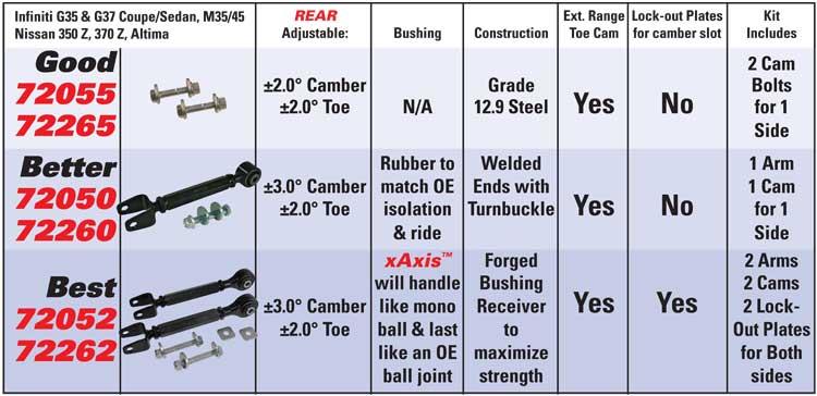 Enhance your vehicle’s suspension setup with the SPC Performance Part 72262 rear adjustable camber arms designed specifically for 2008-2013 Infiniti G37 models and the 2009+ Nissan 370Z. Crafted for track enthusiasts, these arms allow precise alignment adjustments with a range of ±3 degrees camber and ±2 degrees toe, enabling optimal handling and tire wear management. The set includes high-performance SPC xAxis sealed flex joints, which mimic monoballs but utilize non-metal bushings for smooth operation and durability under aggressive driving conditions. These joints are paired with forged steel receivers and straight-arm construction, significantly reducing compliance under load for enhanced stability during high-speed maneuvers. The included camber lockout plates replace OEM camber cams, providing a secure and reliable way to lock in your alignment settings, ensuring consistent performance over time. Built for serious track use, these arms are engineered to maximize suspension precision and durability without sacrificing ride quality, making them an essential upgrade for dedicated racers and performance enthusiasts alike. Whether you’re fine-tuning your car for competitive events or seeking a reliable suspension upgrade, the SPC Performance rear adjustable camber arms deliver the control and confidence needed to push your vehicle to its limits.