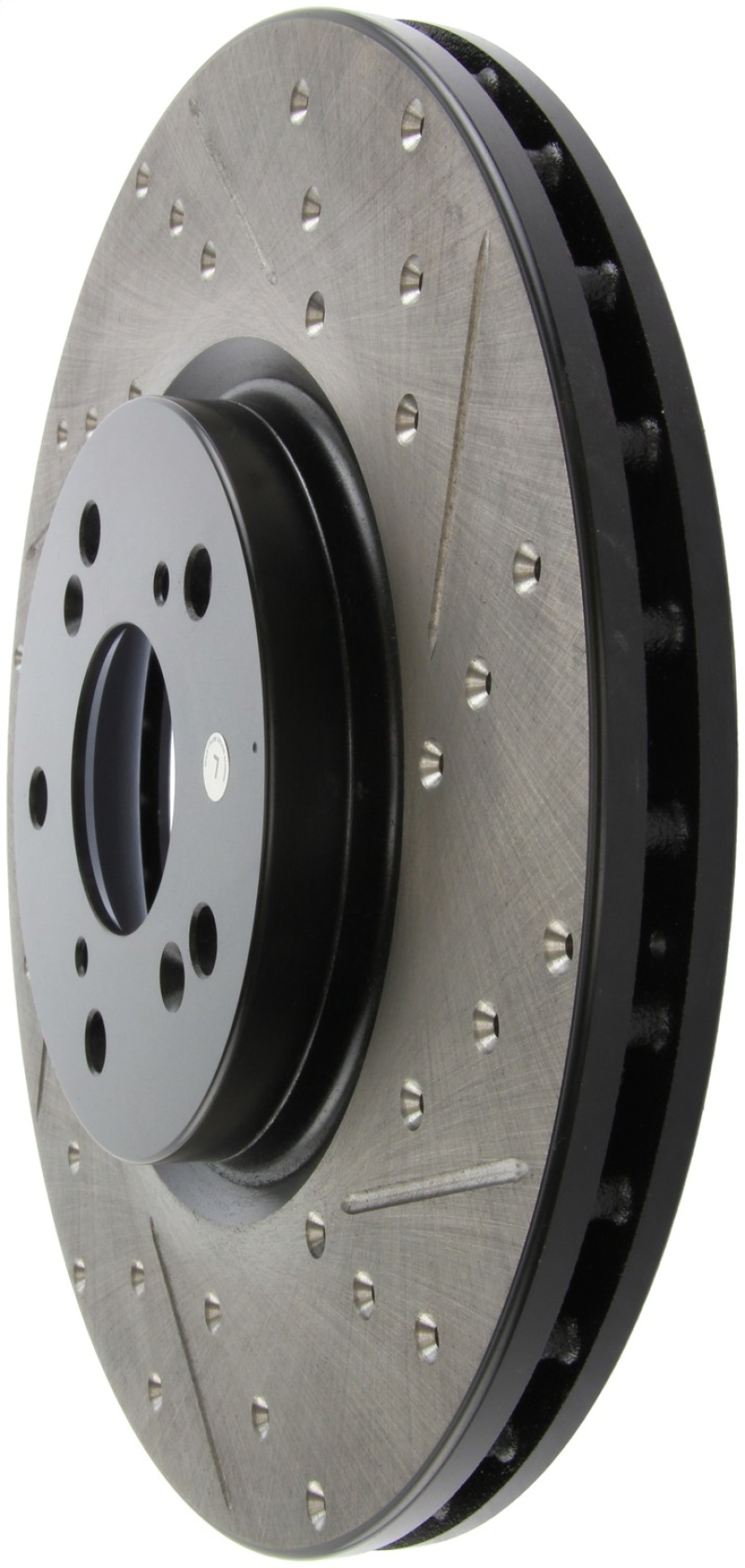 Upgrade your Acura TL with the StopTech 04-08 Acura TL SportStop Slotted & Drilled Front Rotor, designed to deliver enhanced braking performance and durability. Crafted from high-carbon metallurgy and featuring a black e-coating, this rotor offers superior corrosion resistance and quieter operation. Its unique cross-drilling and slotting assist with heat dissipation and brake dust removal, ensuring consistent performance under demanding driving conditions. The drilled and slotted design increases initial bite and improves wet weather response, making it especially effective in adverse conditions. Built as a direct OE replacement, this rotor fits seamlessly on your vehicle, providing an aesthetic upgrade as well as functional benefits for your factory brake system and stock calipers. The advanced metallurgy incorporates Molybdenum and Chromium, which resist cracking and thermal stress, extending the lifespan of your braking components. The rotor’s directional curve vane design on specific applications further enhances heat management and overall performance. Ideal for drivers seeking increased braking power, improved looks, and reliable operation, the StopTech SportStop rotor is a smart choice for your Acura TL.