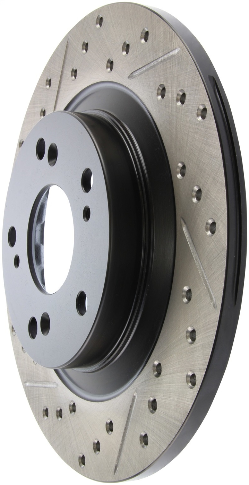 Upgrade your Honda S2000 with the StopTech 127.40050R drilled and slotted sport rotor, designed for optimal performance and durability. These 1-piece rotors are direct replacements for factory brake discs and are engineered to enhance braking efficiency and appearance. The unique cross-drilling and slotting help with heat dissipation, brake dust removal, and gas evacuation, resulting in improved stopping power and reduced brake fade during aggressive driving or in wet conditions. Built with high-quality metallurgy and coated with a black e-coating, these rotors provide excellent corrosion resistance and quieter operation, especially when paired with high-friction European-style brake pads. The addition of molybdenum and chromium in the alloy enhances crack resistance and overall rotor longevity, making them a reliable choice for spirited driving or daily use. These rotors are specifically designed for Honda S2000 models from 2000 to 2009, including various model years, and are a perfect direct OE replacement. The double disk ground surface ensures a consistent friction interface, while the directional curve vane design improves thermal management. With increased initial bite and superior wet weather response, these rotors are ideal for drivers seeking improved braking performance without sacrificing durability or style.