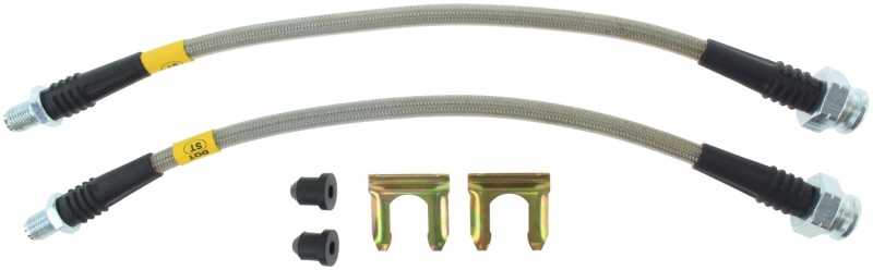 Upgrade your Nissan 240SX with the StopTech Part Number 950.42510 rear stainless steel braided brake lines, designed to deliver a more responsive and consistent braking experience. Constructed with a PTFE inner liner that resists expansion under pressure, these lines ensure that brake pressure is maintained for improved pedal feel. The stainless steel woven braid provides excellent support, impact resistance, and abrasion protection, making them ideal for both street and performance driving. The clear PVC cover guards against chafing, while strain relief devices reinforce end fittings for long-lasting durability.