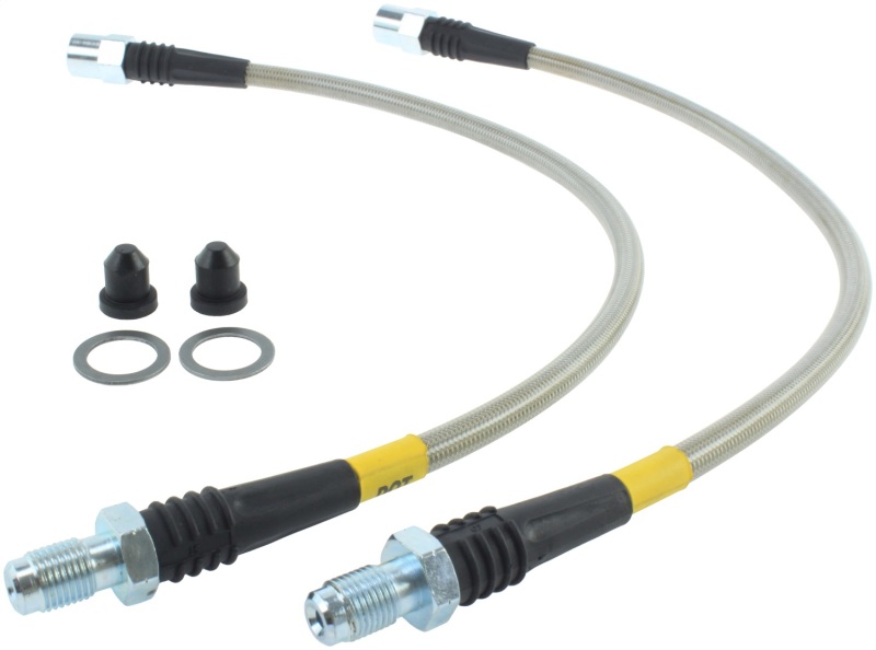Upgrade your BMW Z3 M Series with the StopTech Stainless Steel Braided Rear Brake Lines, designed to deliver a more responsive and consistent braking performance. These lines help maintain steady brake pressure, resulting in a firmer pedal feel and improved modulation during threshold braking. The enhanced pedal feedback is particularly noticeable on older vehicles where factory rubber lines may have softened or swelled over time, restoring a more direct brake response and confidence in stopping power. Crafted with precision, the lines feature a PTFE inner liner resistant to expansion under pressure, ensuring minimal fluid deformation and maintaining brake consistency under demanding conditions. The stainless steel woven braid provides superior support, impact resistance, and abrasion protection, while the clear PVC cover prevents chafing and wear. Each line is equipped with strain relief devices that reinforce the end fittings, ensuring a secure fit and long-lasting durability. These brake lines are compatible with a range of BMW models, including the 2001 BMW Z3, 2000 BMW Z3, and 1999 BMW Z3, as well as the 1995-2001 BMW 740i and 740iL, and the 1998-2002 BMW Z3. All necessary brackets and fasteners are included, making installation straightforward and hassle-free. These DOT-compliant brake lines are fully tested for quality and reliability, providing peace of mind during high-performance driving or everyday use. Whether upgrading for safety, performance, or restoration, the StopTech BMW Z3 M Series Stainless Steel Braided Brake Lines offer a significant improvement in brake pedal feel and modulation, ensuring optimal stopping power in all driving conditions.