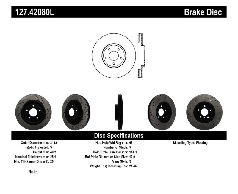 Upgrade your vehicle’s braking system with the StopTech Part Number 127.42080L drilled and slotted sport rotors, designed specifically for 2006 Nissan 350Z and Infiniti G35 models. These high-performance, one-piece rotors are direct replacements for factory brake discs and are engineered to deliver improved braking response and durability. Featuring unique cross-drilling and slotting, these rotors facilitate heat dissipation and brake dust removal, which helps prevent glazing and ensures consistent brake pad contact for optimal stopping power in both wet and dry conditions. The aesthetic appeal of the rotors is enhanced by their black e-coating, which offers superior corrosion resistance, while the advanced metallurgy, including added molybdenum and chromium, resists cracking and reduces brake noise. These rotors are particularly effective with higher friction European-style brake pad compounds, providing increased initial bite and better performance during aggressive driving. Built for durability, the rotors incorporate directional curve vane designs on select applications to enhance airflow and cooling, making them suitable for spirited driving and daily use alike. The double disk ground surface ensures a consistent friction surface, contributing to smoother braking and extended pad life. The StopTech sport rotors are engineered to replace OEM parts seamlessly, offering a reliable upgrade that improves both appearance and performance. With their superior resistance to thermal stress and cracking, these rotors provide a confident braking experience, whether navigating city streets or high-performance driving scenarios. Designed for easy installation and long-lasting performance, they are a perfect choice for enthusiasts seeking to enhance their vehicle’s braking capability without compromising reliability or style.