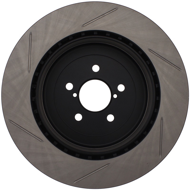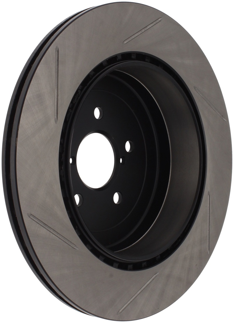 The StopTech Power Slot 04 STi Rear Left Slotted Rotor is designed to be a direct replacement for your factory brake system, offering a significant upgrade in braking performance and durability. Constructed with high-quality metallurgy and finished with a protective black e-coating, this rotor resists corrosion and maintains optimal performance in various driving conditions. Its unique slotting pattern helps dissipate heat and brake dust efficiently, reducing the risk of glazing and maintaining consistent friction during aggressive braking. This feature enhances both wet and dry braking response, ensuring safety and confidence behind the wheel.
