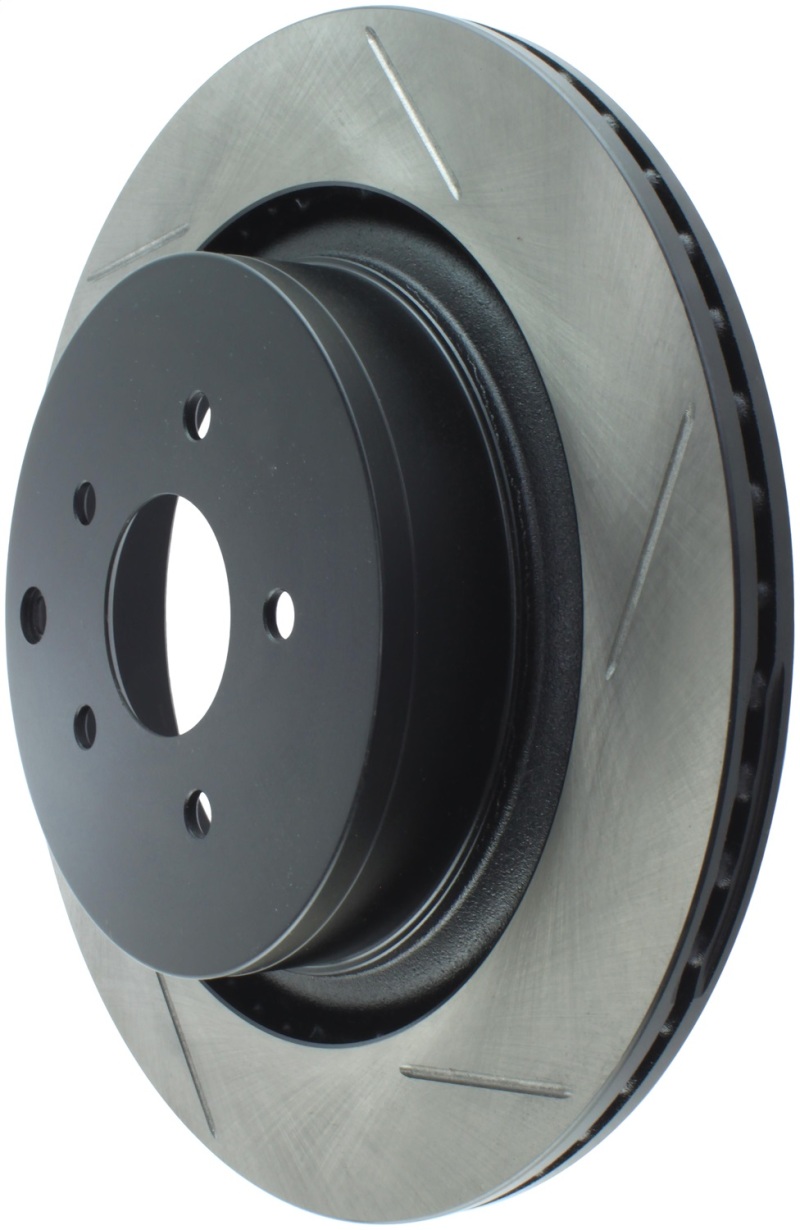 Upgrade your Infiniti FX50 with the StopTech Power Slot 09 Infiniti FX50 5.0L V8 Rear Left Slotted Rotor, designed to deliver superior braking performance and durability. Crafted from high-quality metallurgy, this one-piece rotor features advanced materials that resist cracking and reduce noise, providing a quieter and more reliable braking experience. The black e-coating offers excellent corrosion protection, ensuring the rotor maintains its appearance and functionality over time. Its design includes strategically placed slots that help evacuate gases, brake dust, and heat, which improves initial bite and wet weather response, making it ideal for high-performance driving conditions.