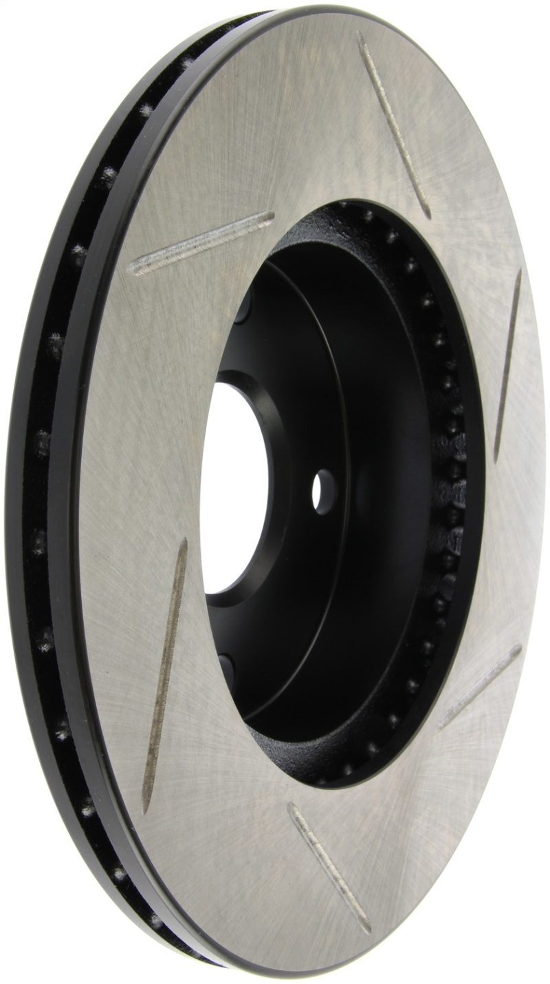 Upgrade your Mazda Miata with the StopTech Power Slot 89-93 Mazda Miata SportStop Slotted Front Right Rotor, part number 126.45034SR. Designed as a direct replacement for factory brake discs, this high-performance rotor enhances braking response and durability. Its unique slotting pattern facilitates heat dissipation and brake dust removal, reducing the risk of pad glazing and ensuring consistent braking performance in various driving conditions. The black e-coating provides excellent corrosion resistance, maintaining a clean appearance over time. Constructed with high carbon metallurgy, this rotor offers quieter operation, increased crack resistance, and improved overall durability, making it suitable for spirited driving and daily use alike.