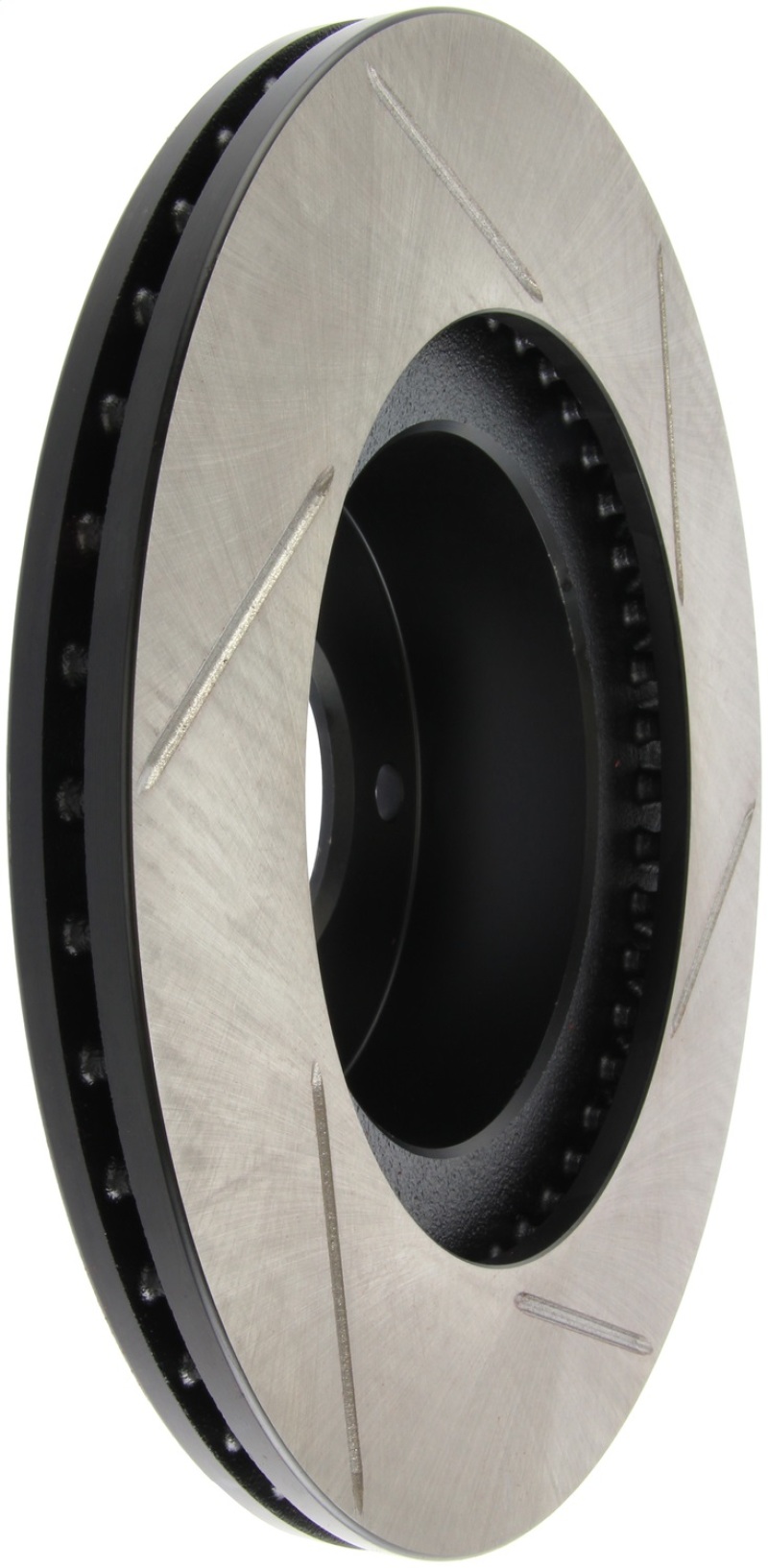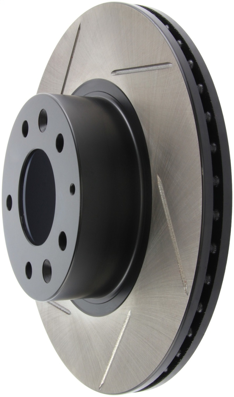 Upgrade your Mazda RX-7 with the StopTech Power Slot 93-95 Mazda RX-7 SportStop Slotted Front Right Rotor. Designed as a direct replacement for factory brake discs, this rotor enhances braking performance while maintaining a sleek appearance behind your wheels. The unique slotting pattern facilitates heat dissipation, brake dust removal, and helps prevent brake pad glazing, resulting in improved initial bite and superior wet and dry braking response. Built with advanced metallurgy and coated with a durable black e-coating, this rotor offers excellent corrosion resistance and longevity. The high carbon content in most applications contributes to quieter operation, better crack resistance, and increased performance under thermal stress.