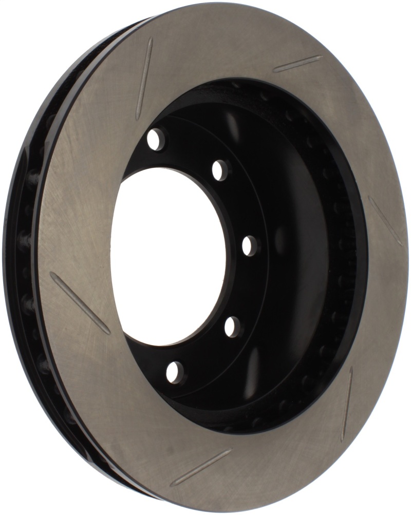 The StopTech Power Slot Part Number 126.65086CSR is a high-performance replacement brake rotor designed for select Ford trucks including the 2000-2005 Ford F-250, F-350 Super Duty, and the 2004 Ford Excursion. Engineered for durability and superior braking performance, this rotor features a split-core cast design with symmetric vanes to promote uniform heat distribution and reduce the risk of thermal cracking. The black E-coat anti-corrosive coating provides long-lasting protection against rust and corrosion, significantly outperforming standard spray paint finishes. The double disc ground friction surface ensures consistent braking performance and extended service life, making it suitable for demanding driving conditions.