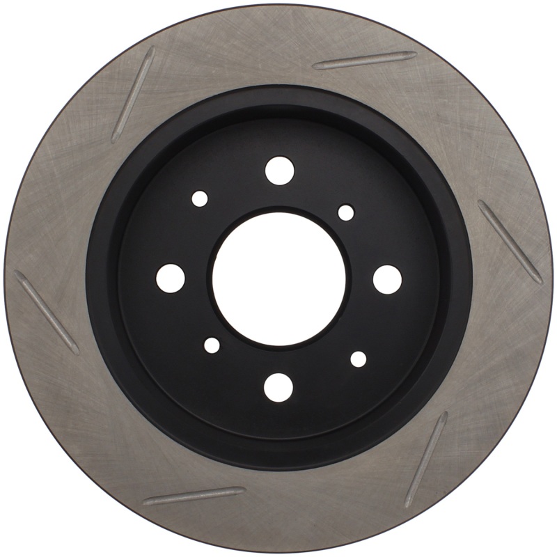 The StopTech Power Slot Rear Left Rotor, part number 126.40017SL, is a high-performance, one-piece replacement brake rotor designed to improve your vehicle’s braking efficiency. Crafted with advanced metallurgy and finished with a durable black e-coating, this rotor offers excellent corrosion resistance and long-lasting performance. Its slotted design enhances heat dissipation, brake dust removal, and gas evacuation, which collectively contribute to more consistent braking and reduced brake fade during spirited driving or heavy-duty use. Built for durability, the rotor features directional curve vane designs on select applications for optimized airflow and cooling.