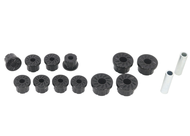 - All-in-one kit covering front and rear leaf spring eyes and shackle bushings